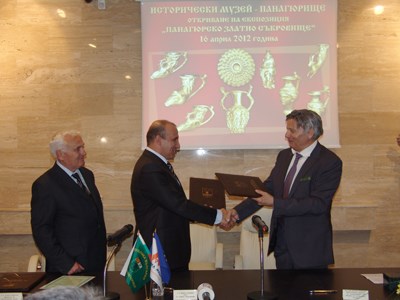 “Няма еквивалент на това, което дарявате”, подчерта кметът на общината г-н Никола Белишки и поднесе на д-р инж.Лъчезар Цоцорков символичен подарък - копие от страницата с подписката за връщане на Съкровището в Панагюрище, където изпълнителният директор на дружеството се е подписал като гражданин през есента на 2010 година. На директора на Историческия музей градоначалникът пък подари цялата подписка с думите: “Това е символ на единството!”.