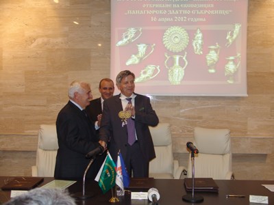 "Всички споменават, че след 63 години Панагюрското златно съкровище се връща в родния си град, но задавате ли си въпроса защо цели 63 години това не е било възможно. Отговорът е простичък - защото никога не се е появила тази политическа воля един министър да сложи подписа си, за да може това съкровище да дойде в родния си край. Това не можеше да стане без политическата воля на правителството, без диалога, който имахме с домакините. Такава политическа воля беше проявена не само за днешното връщане на тракийския уникат на Панагюрското съкровище, както аз го наричам, но и за изработката на неговите две златни копия – които за мен, като скулптор, са си оригинали като качество и стойност...